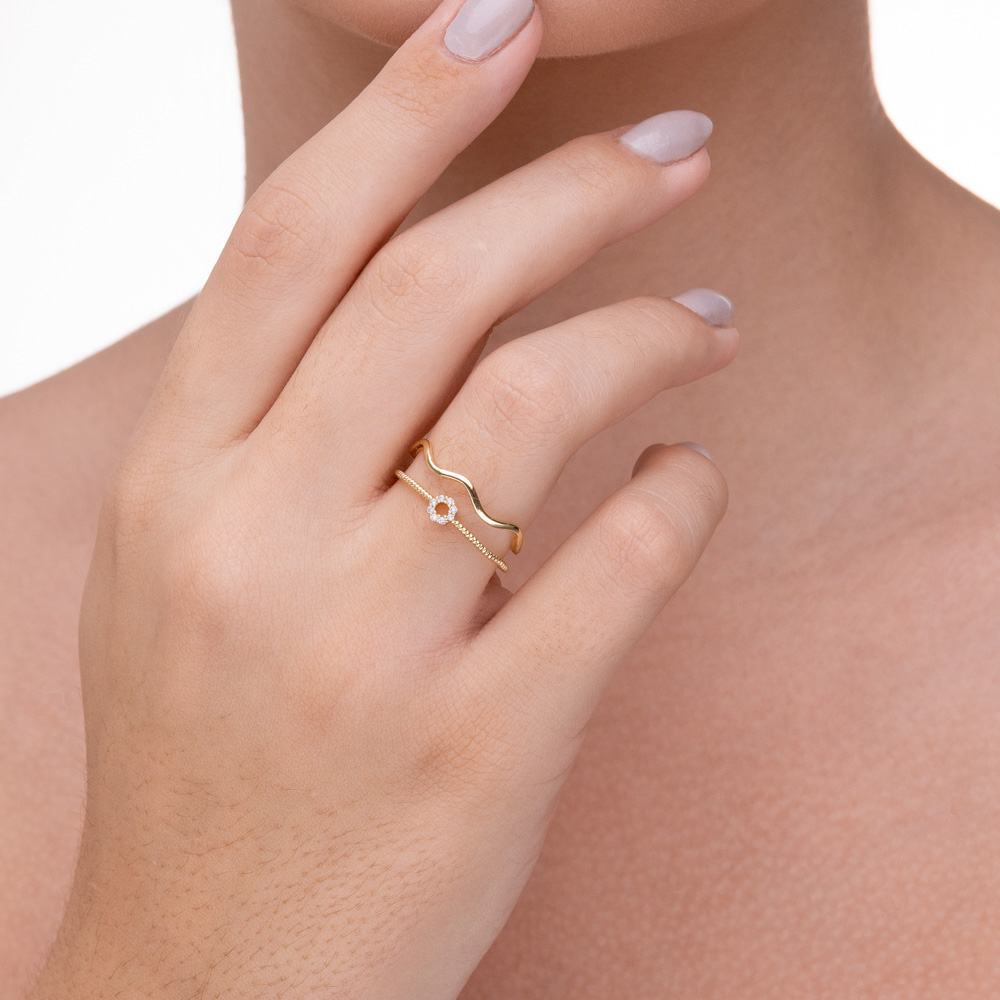 Descrição: Uma peça sofisticada que brinca com diferentes texturas e formas. Este anel aberto apresenta um design de aro duplo assimétrico: um dos aros possui acabamento liso e ondulado, enquanto o outro apresenta uma textura torcida em estilo "corda". O ponto central de destaque é um delicado círculo vazado, inteiramente cravejado com micro-zircônias cristal.