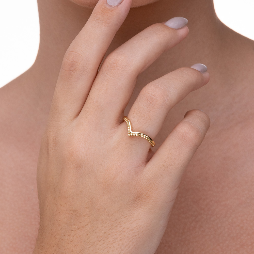 Descrição: Com um design geométrico e minimalista, este anel apresenta um formato em "V" (estilo chevron) que alonga visualmente os dedos. O diferencial está na textura: metade do aro possui acabamento liso e polido, enquanto a parte frontal é adornada com pequenas esferas em relevo (pontilhismo), criando um contraste moderno e delicado.