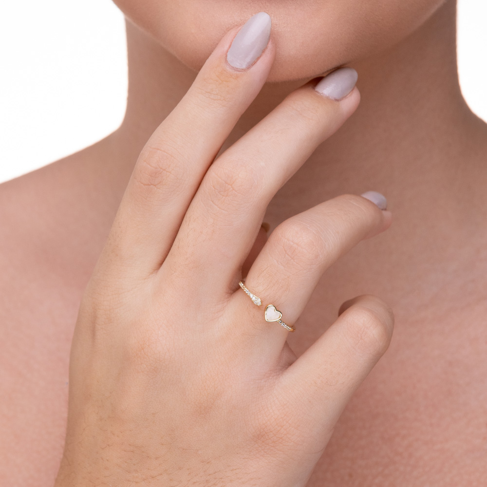 Descrição: Um design delicado e contemporâneo que une o romantismo à sofisticação. Este anel apresenta uma estrutura aberta (estilo ajustável), com uma extremidade finalizada por um coração esculpido em madrepérola natural, emoldurado por metal polido. O aro é graciosamente trabalhado com cravejamento de micro-zircônias cristal em ambos os lados, garantindo um brilho sutil a cada movimento.