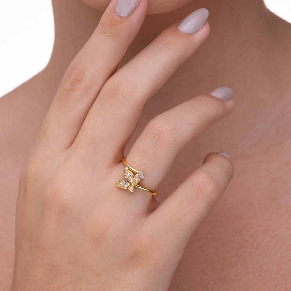 Descrição: Este anel apresenta um design encantador com uma borboleta central rica em detalhes. Uma das asas é inteiramente cravejada com micro-zircônias cristal, enquanto a outra mantém o brilho do metal polido. O diferencial está no aro, que possui uma curvatura elegante que abraça a borboleta e o dedo, conferindo um visual dinâmico e moderno.
