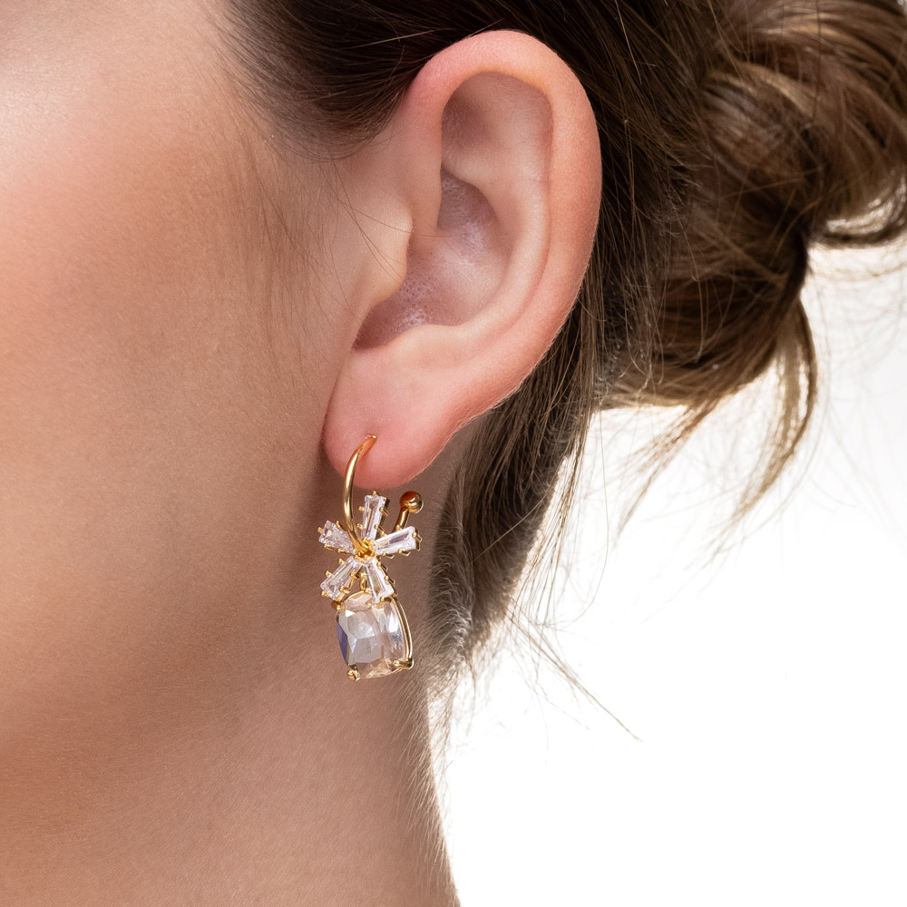 Descrição Curta: Uma peça "statement" que exala brilho e personalidade. Este brinco apresenta uma base em argola estilo anzol (hook), decorada com uma estrela central composta por zircônias em lapidação baguete. Logo abaixo, um imponente cristal retangular translúcido completa o pendente, criando um jogo de luzes multifacetado e luxuoso.