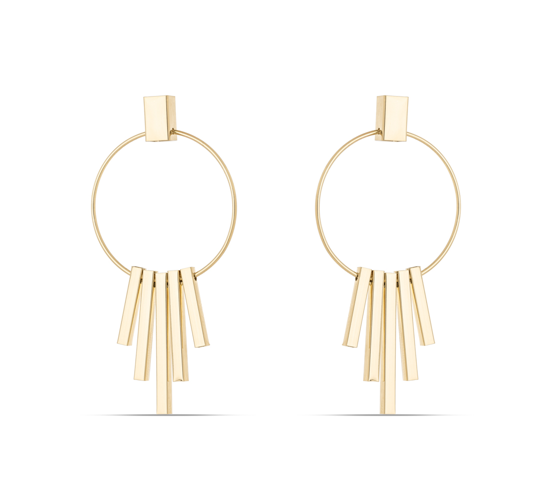 Design: Argola maxi com pendentes em bastões geométricos e base fixa retangular.