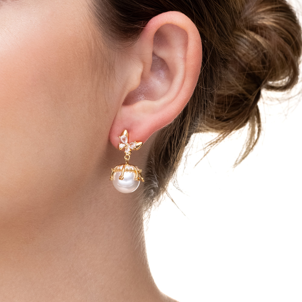Descrição: Um design romântico e refinado. A base deste brinco apresenta uma delicada borboleta com as asas superiores em zircônias lapidação navete e o corpo cravejado em micro-zircônias cristal. De sua base, suspende uma luxuosa pérola shell perfeitamente redonda, coroada por uma delicada cúpula dourada trabalhada com detalhes em relevo e brilho.