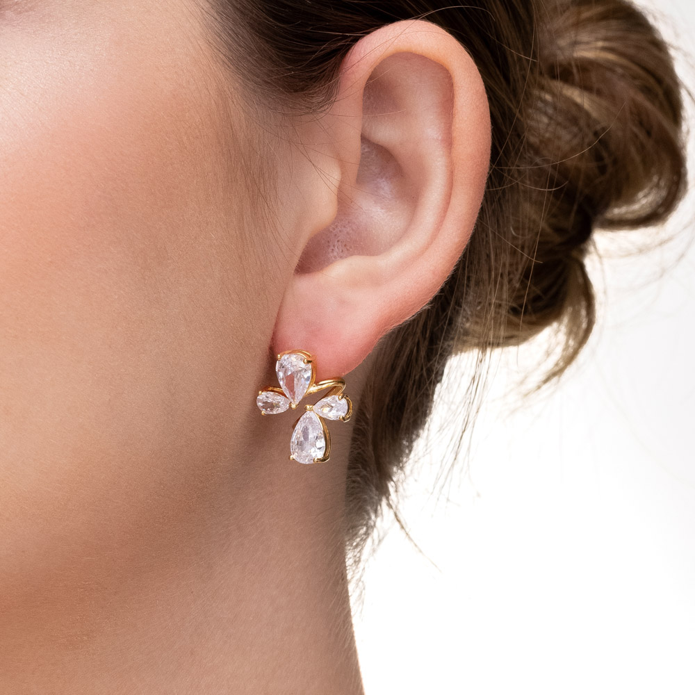 Descrição Curta: A delicadeza das formas orgânicas aliada a um brilho impactante. Este brinco folheado a ouro apresenta um design em formato de borboleta, composto por quatro zircônias incolores em lapidação gota de alta qualidade. É a peça perfeita para iluminar o rosto com sofisticação, unindo um toque romântico a uma estética contemporânea.