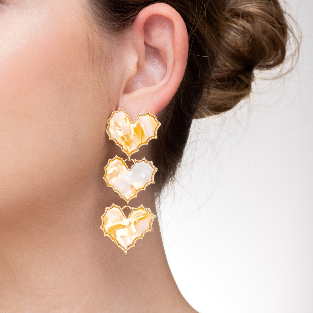 Descrição Curta: Uma joia de impacto que transborda feminilidade e estilo. Este brinco de bijuteria fina apresenta uma cascata de três corações articulados, esculpidos em resina com um sofisticado efeito marmorizado em tons de madrepérola e âmbar. Cada coração é emoldurado por uma delicada borda trabalhada em banho dourado, criando um movimento gracioso que ilumina o rosto com elegância.