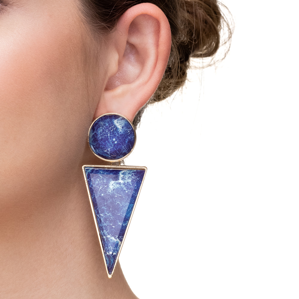 Descrição: Um acessório de design moderno e estruturado que explora o contraste entre formas circulares e triangulares. O brinco apresenta uma base de botão circular que suspende um pendente em formato de triângulo invertido, ambos com um luxuoso acabamento em resina que imita a textura da pedra