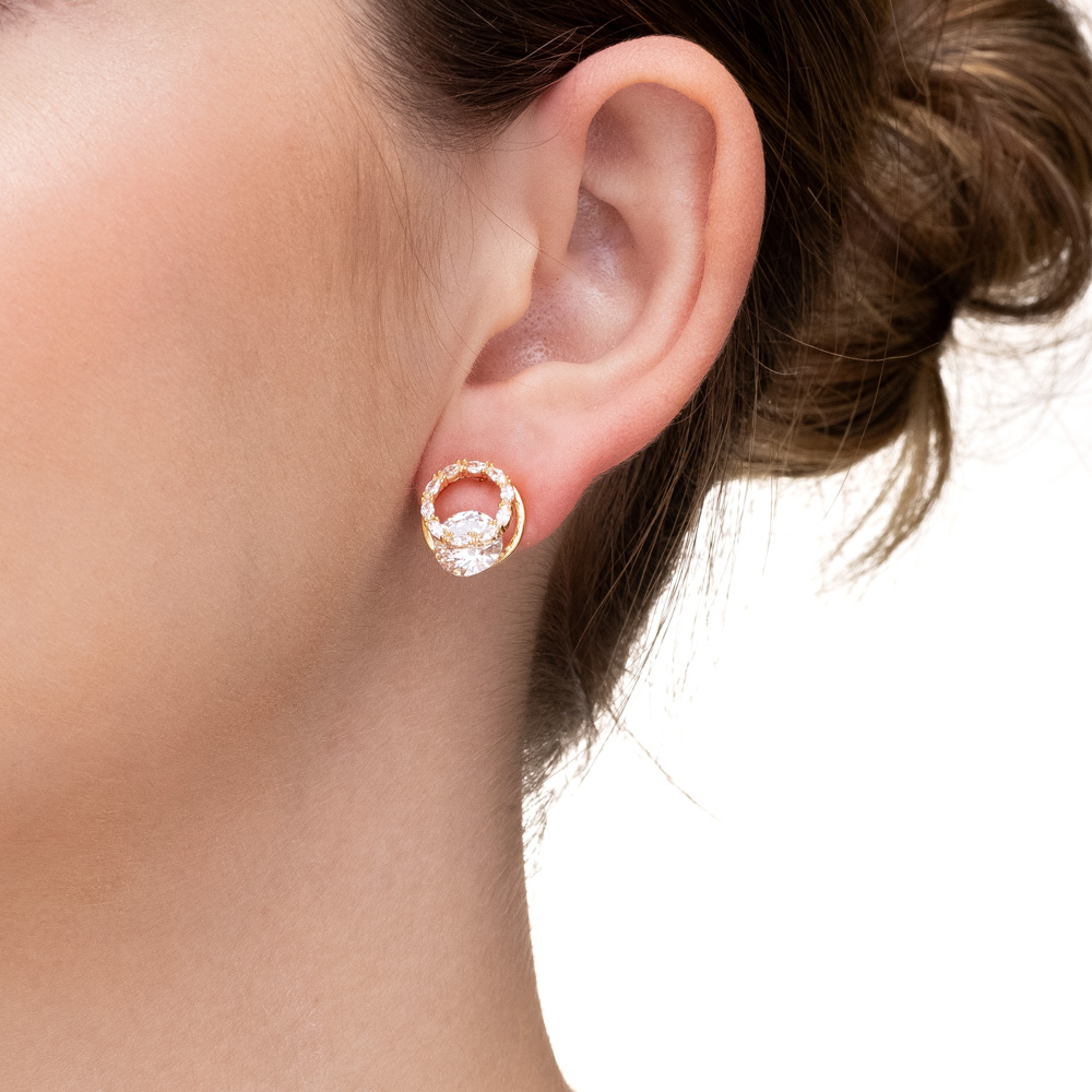 Descrição Curta: Uma joia que exala brilho e sofisticação. Este brinco folheado a ouro apresenta uma imponente zircônia central em lapidação brilhante, abraçada por um aro delicadamente cravejado com zircônias em lapidação marquise e redonda. O design cria um efeito visual de "halo" flutuante, transformando o clássico solitário em uma peça de luxo contemporâneo.