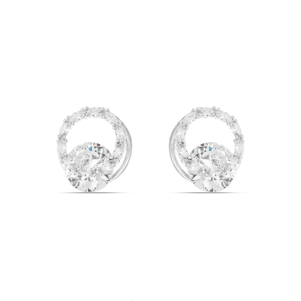 Descrição Curta: A definição do luxo atemporal. Este brinco em banho de ródio apresenta uma magnífica zircônia central em lapidação brilhante, envolvida por um "halo" de zircônias em lapidações marquise e redonda. O acabamento em ródio confere um brilho prateado espelhado de alta joalheria, que potencializa a claridade das pedras e cria um efeito visual de joia verdadeira.