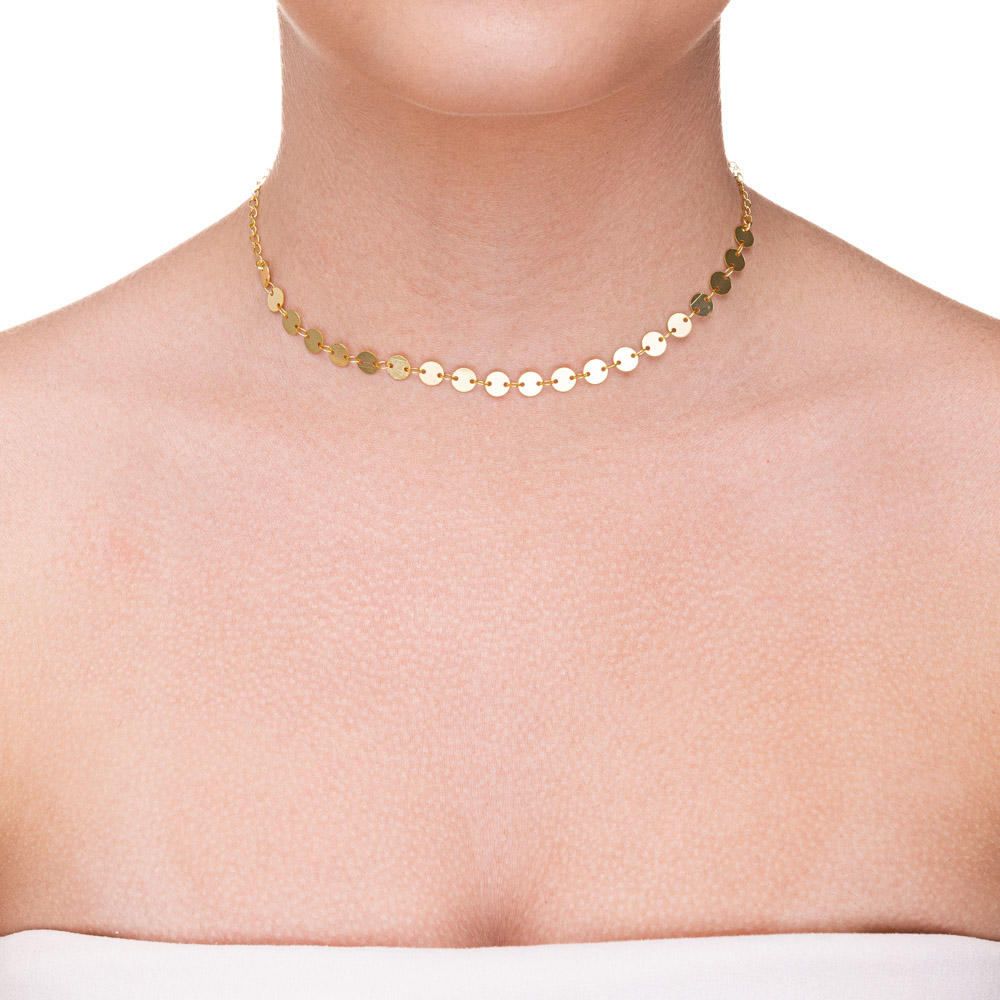 Descrição Curta: Um design minimalista e reluzente. Este colar é composto por uma sequência de pequenas medalhas circulares lisas que captam e refletem a luz a cada movimento, criando um efeito de brilho contínuo e moderno.