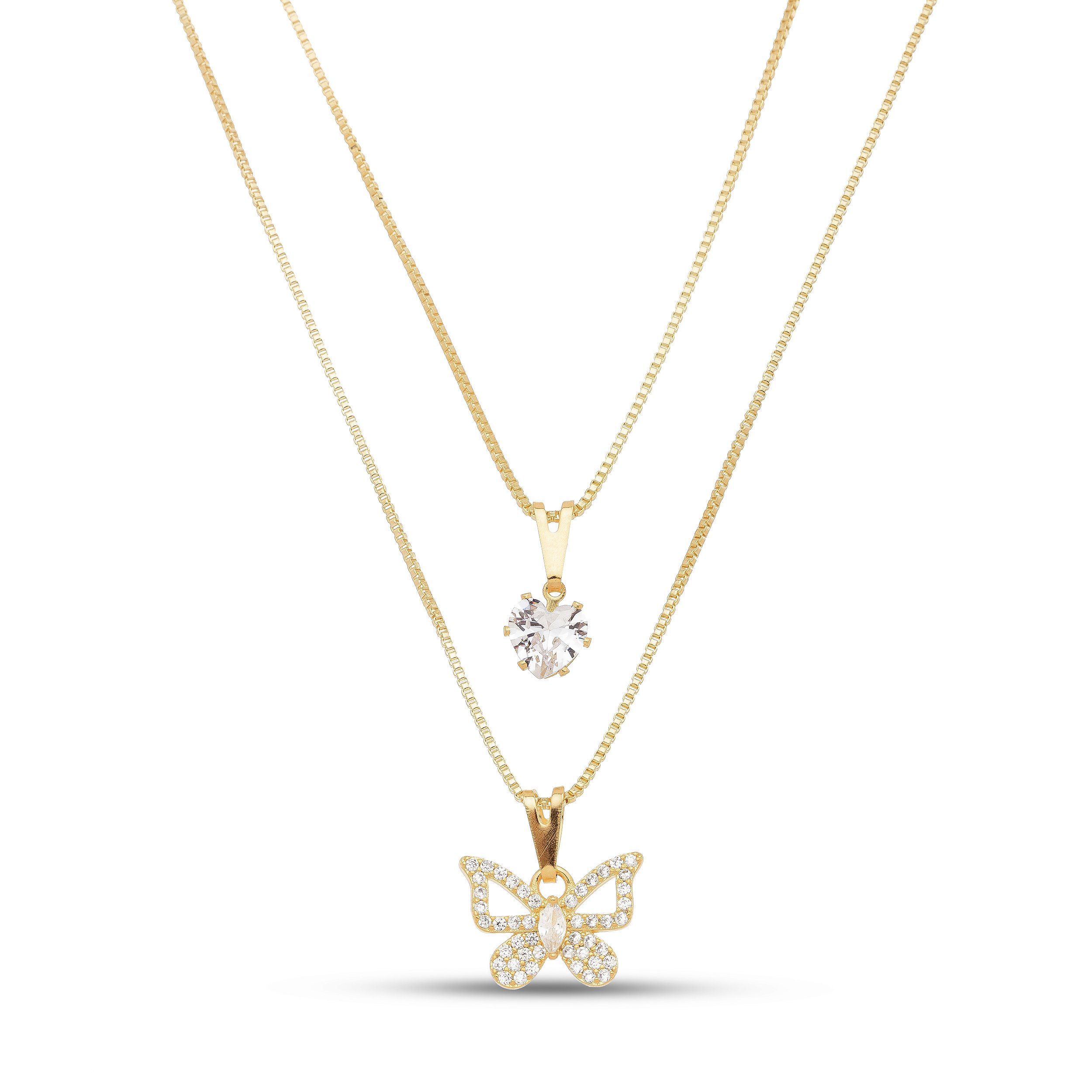 Colar duplo borboleta com pedra de zircônia.