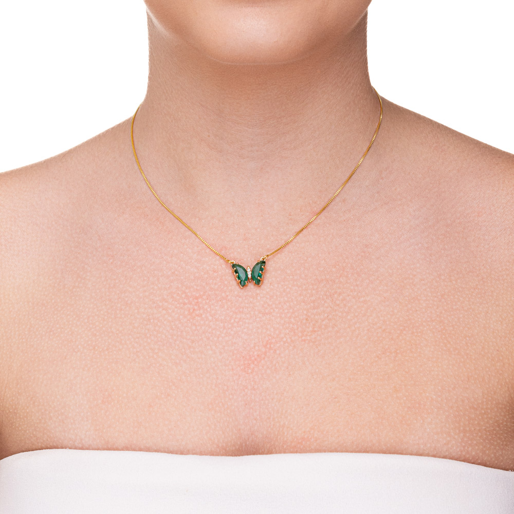 Descrição : Uma peça encantadora que simboliza leveza e transformação. Este colar apresenta um pingente de borboleta com asas em cristal verde esmeralda e corpo cravejado com microzircônias, perfeito para adicionar um toque de cor e natureza ao seu visual.