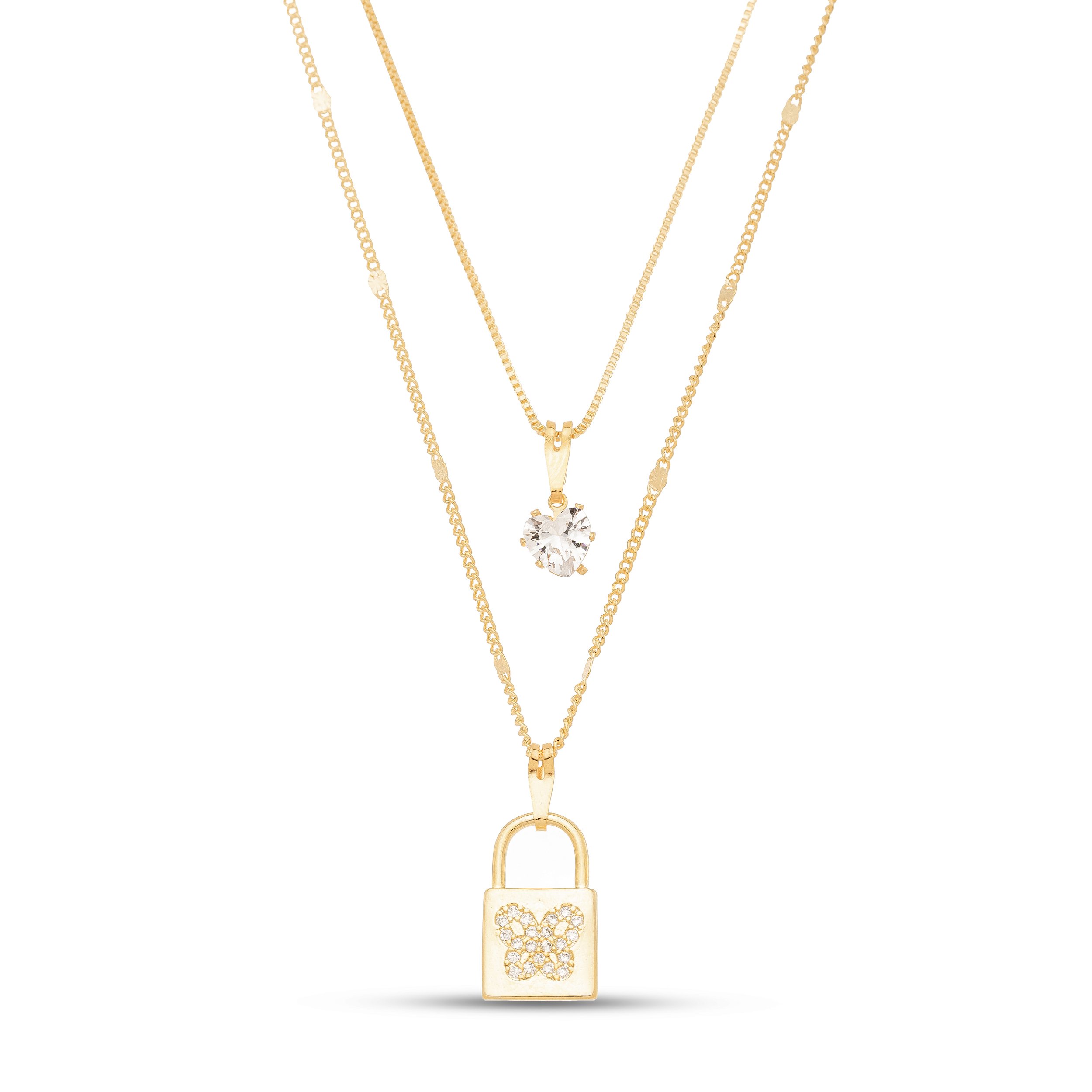 Colar duplo cadeado com borboleta em banho de ouro CL 00063