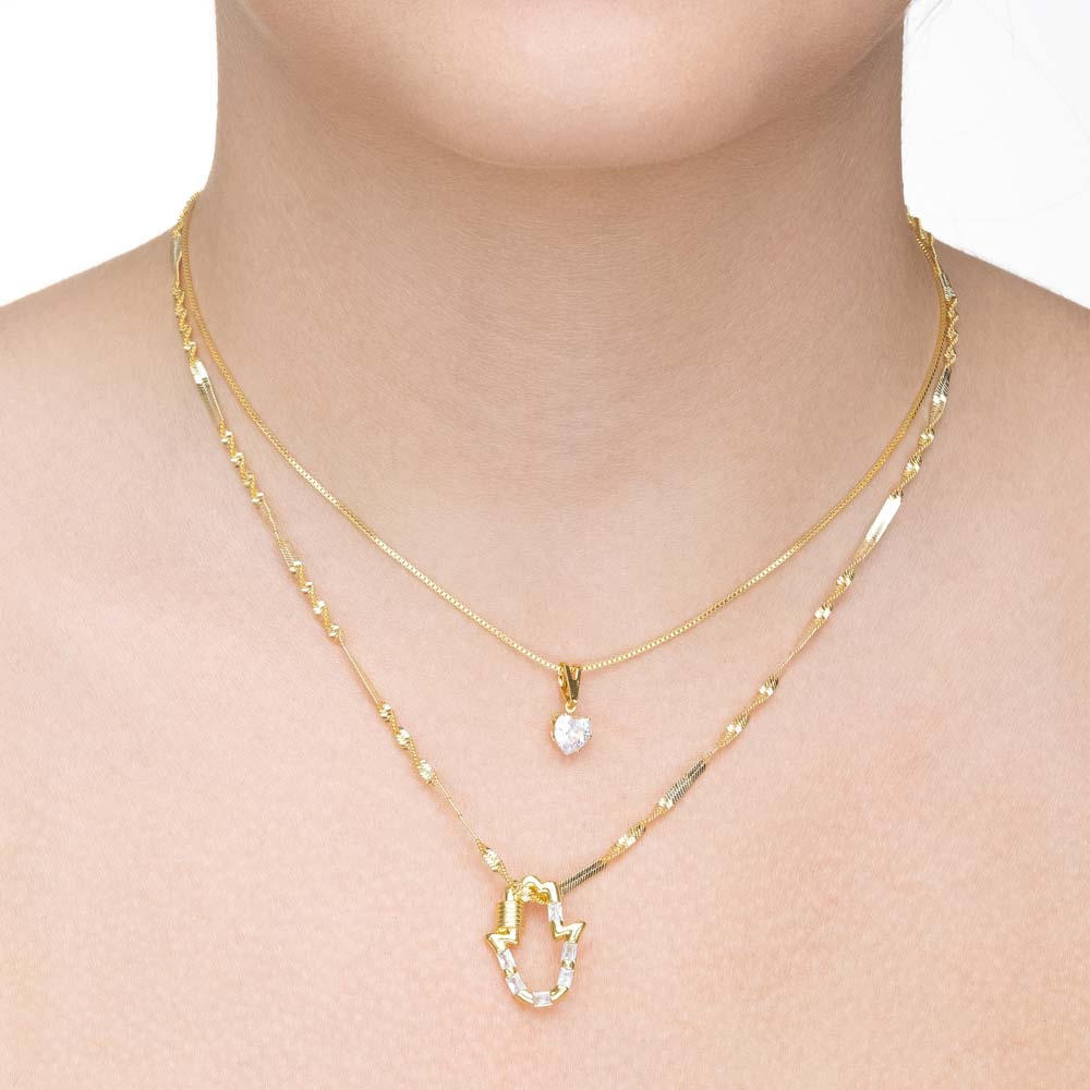 Colar duplo com ponto de luz coração e mão de Fátima folheado a ouro