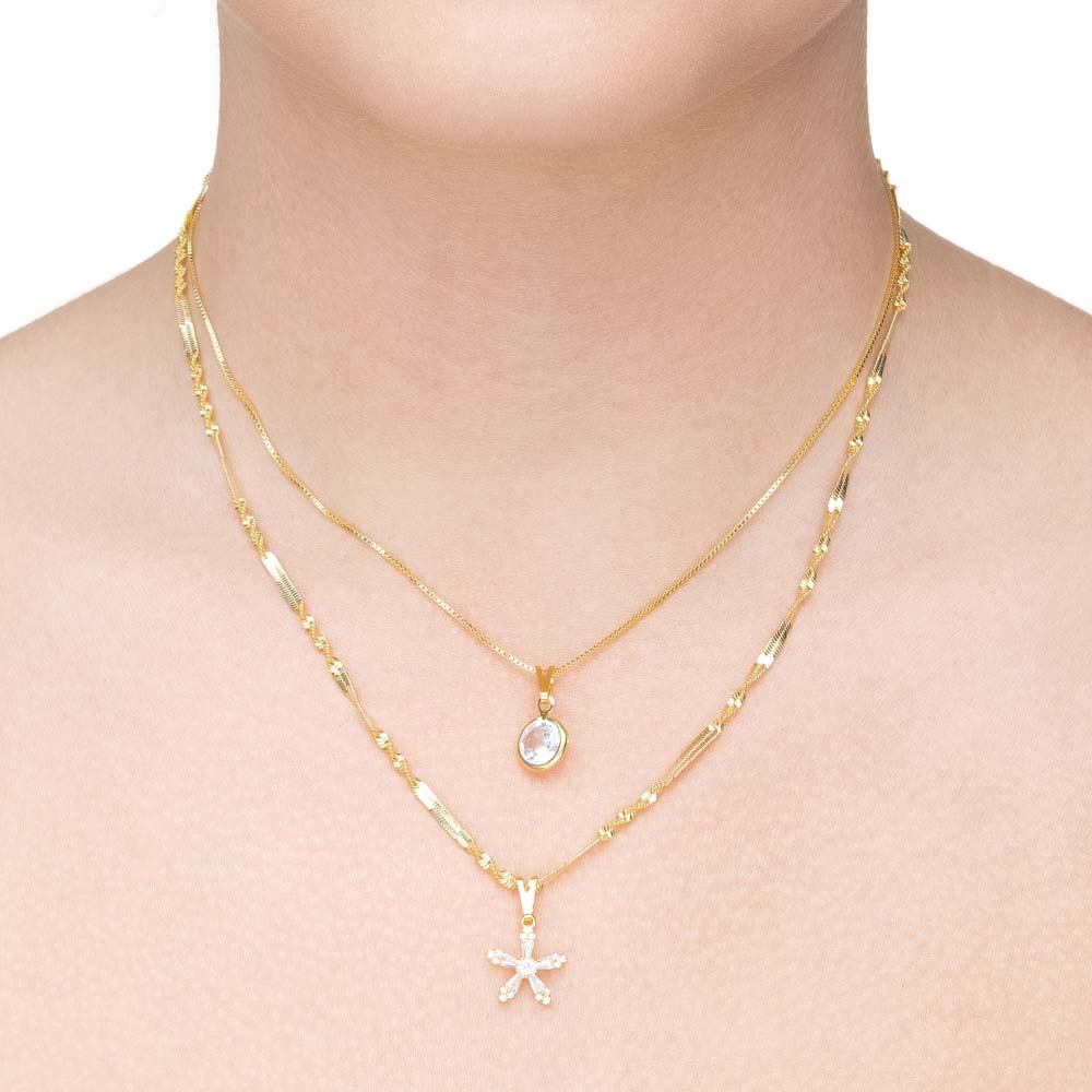 Colar duplo com ponto de luz e flor em zircônia folheado a ouro