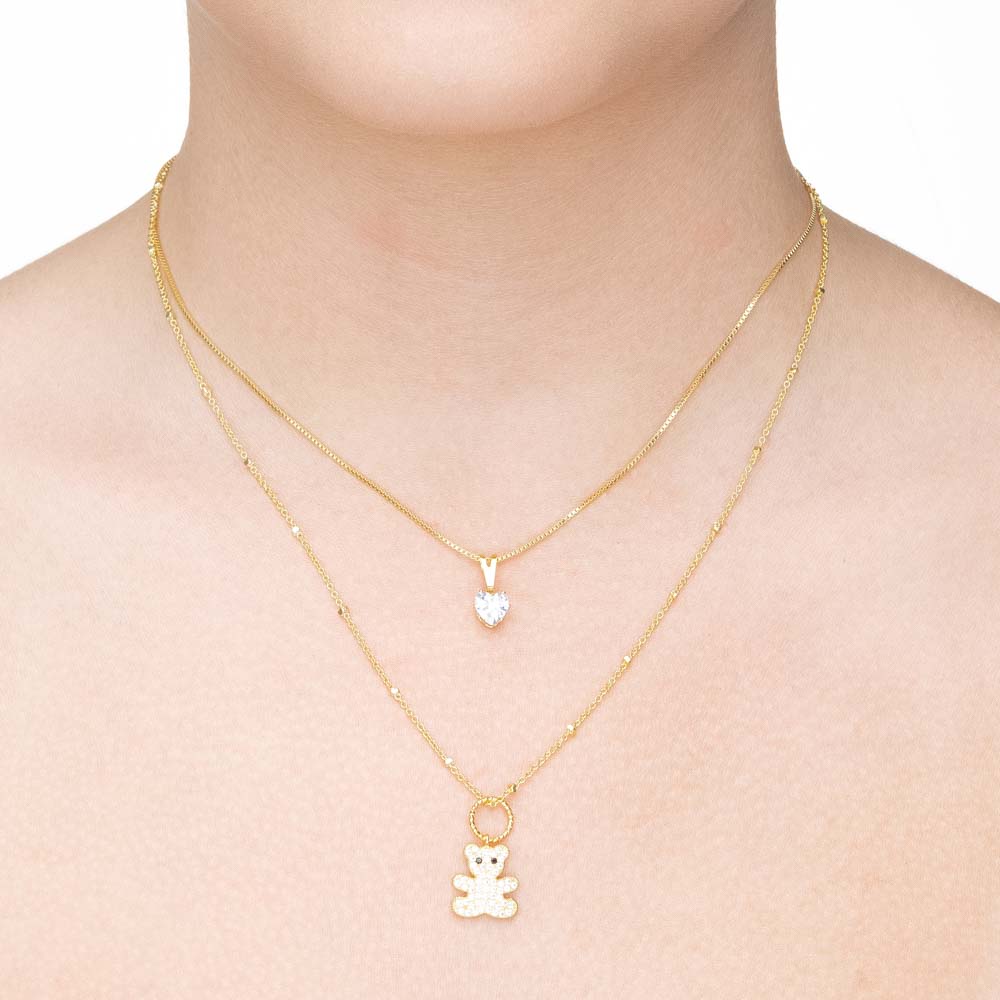 Colar duplo de ursinho com ponto de luz folheado a ouro