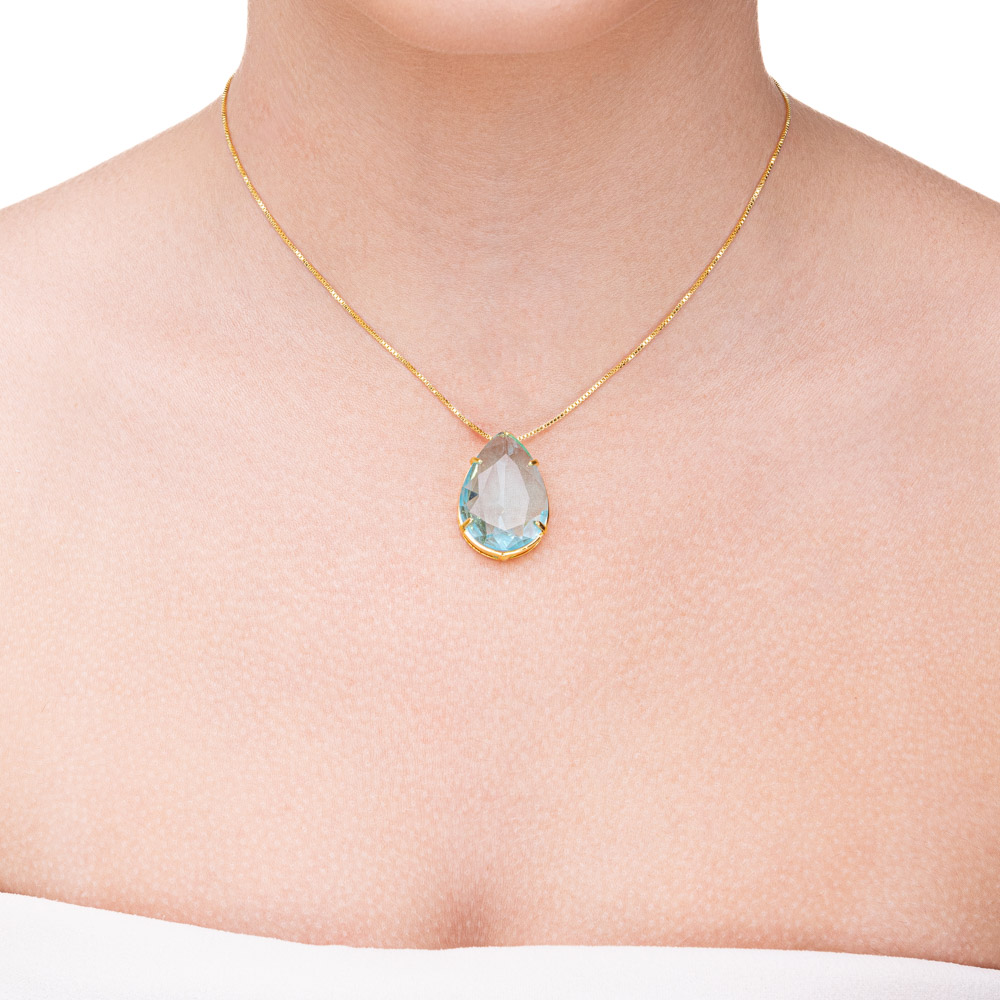 Descrição: Um toque de frescor e elegância. Este colar destaca um imponente cristal em formato de gota na cor azul aquamarine, lapidado para refletir a luz com suavidade e brilho, ideal para iluminar o colo com sofisticação.