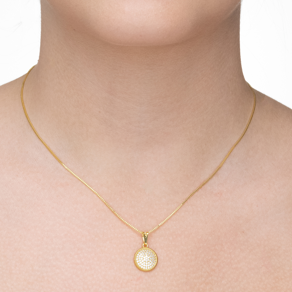 Descrição Curta: O brilho clássico em sua forma mais radiante. Esta medalha circular apresenta uma superfície levemente abaulada, inteiramente cravejada em zircônias incolores, emoldurada por uma borda trabalhada em microesferas douradas. Uma joia versátil que ilumina o colo com sofisticação e luxo discreto.