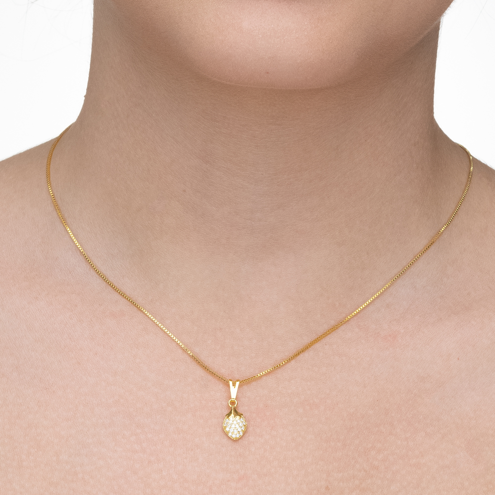 Descrição Curta: Uma peça lúdica e cheia de charme. Este colar apresenta um pingente em formato de morango, com a base delicadamente cravejada por zircônias incolores que simulam as sementes da fruta, contrastando com o brilho polido das folhas douradas. Uma escolha delicada e moderna para iluminar o dia a dia.