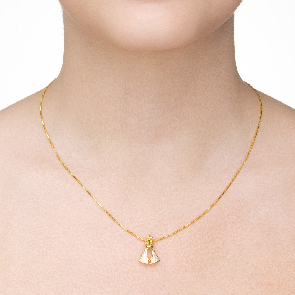 Descrição Curta: Uma joia de rara delicadeza e profundo significado. Este colar apresenta um pingente de Nossa Senhora Aparecida com design vazado e moderno, onde o manto é adornado por zircônias incolores de alto brilho e coroado com detalhes polidos, resultando em uma peça iluminada e atemporal.