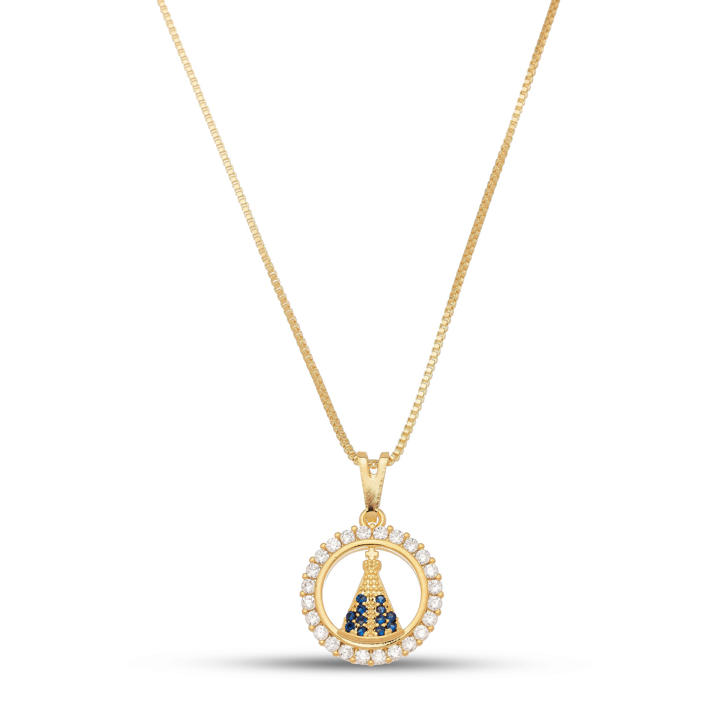 Colar Nossa Senhora Aparecida em banho de ouro com pedra de zircônia.