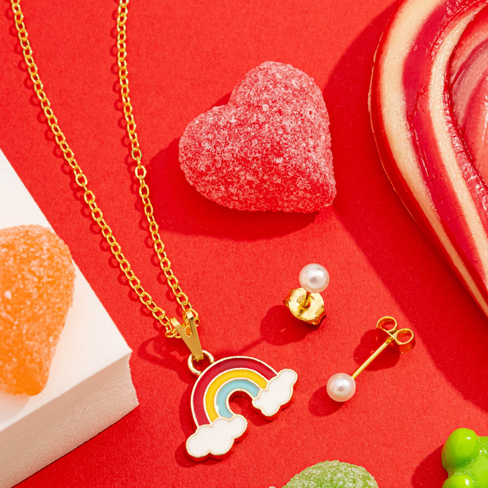 com brincos de perola e colar com pingente de Arco iris esmaltado.