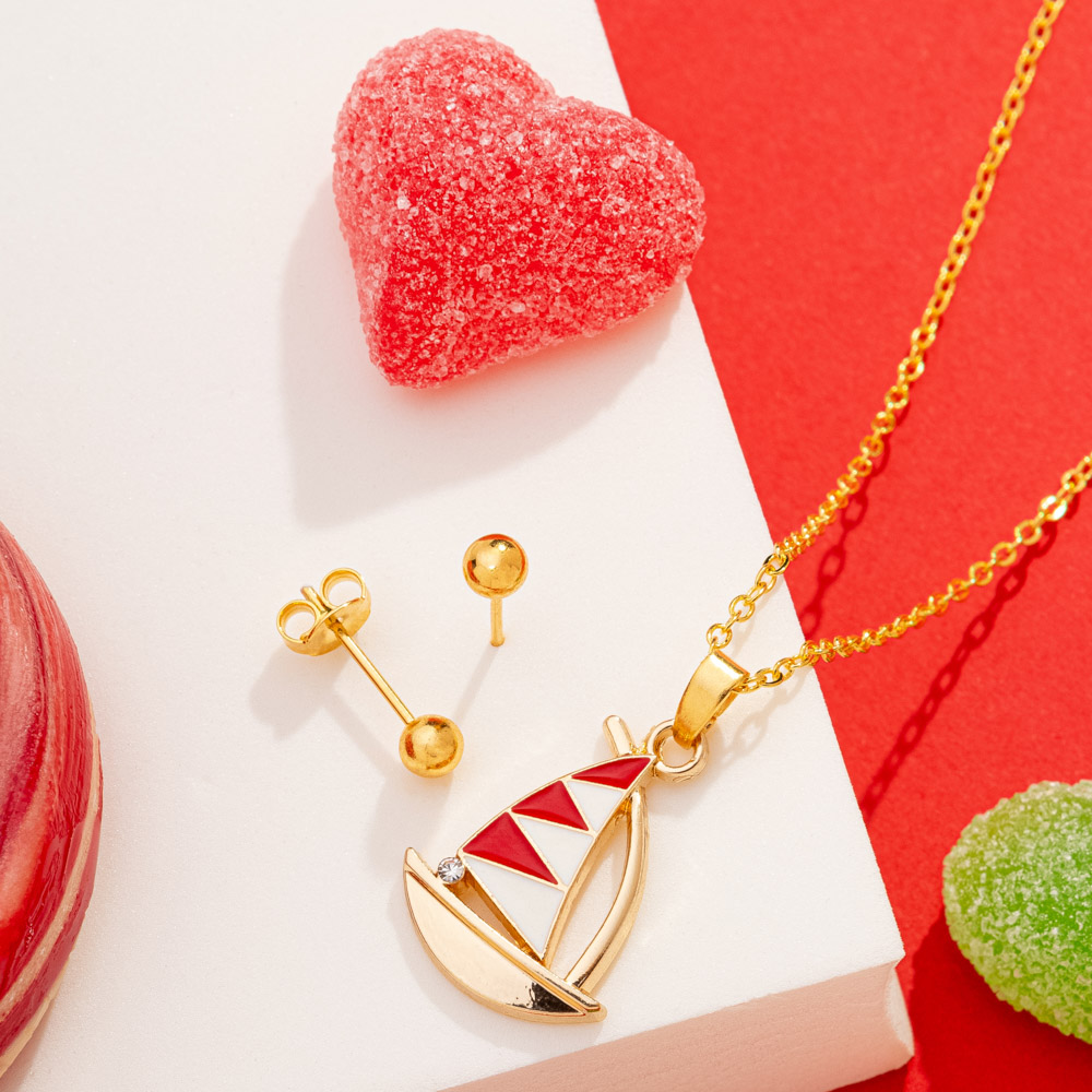 Conjunto infantil com pingente de barco vermelho e brinco de bolinha folheado a ouro