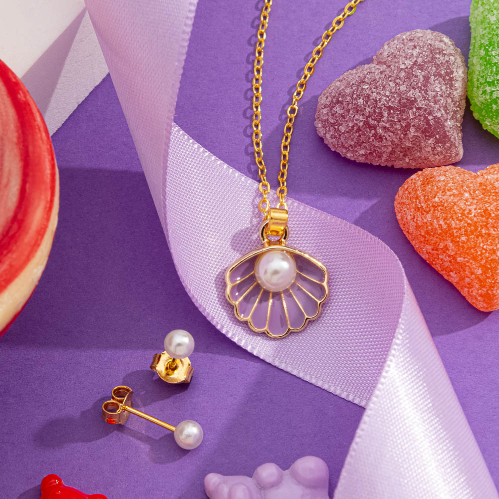 Conjunto infantil com pingente de concha lilás e brinco de pérola folheado a ouro
