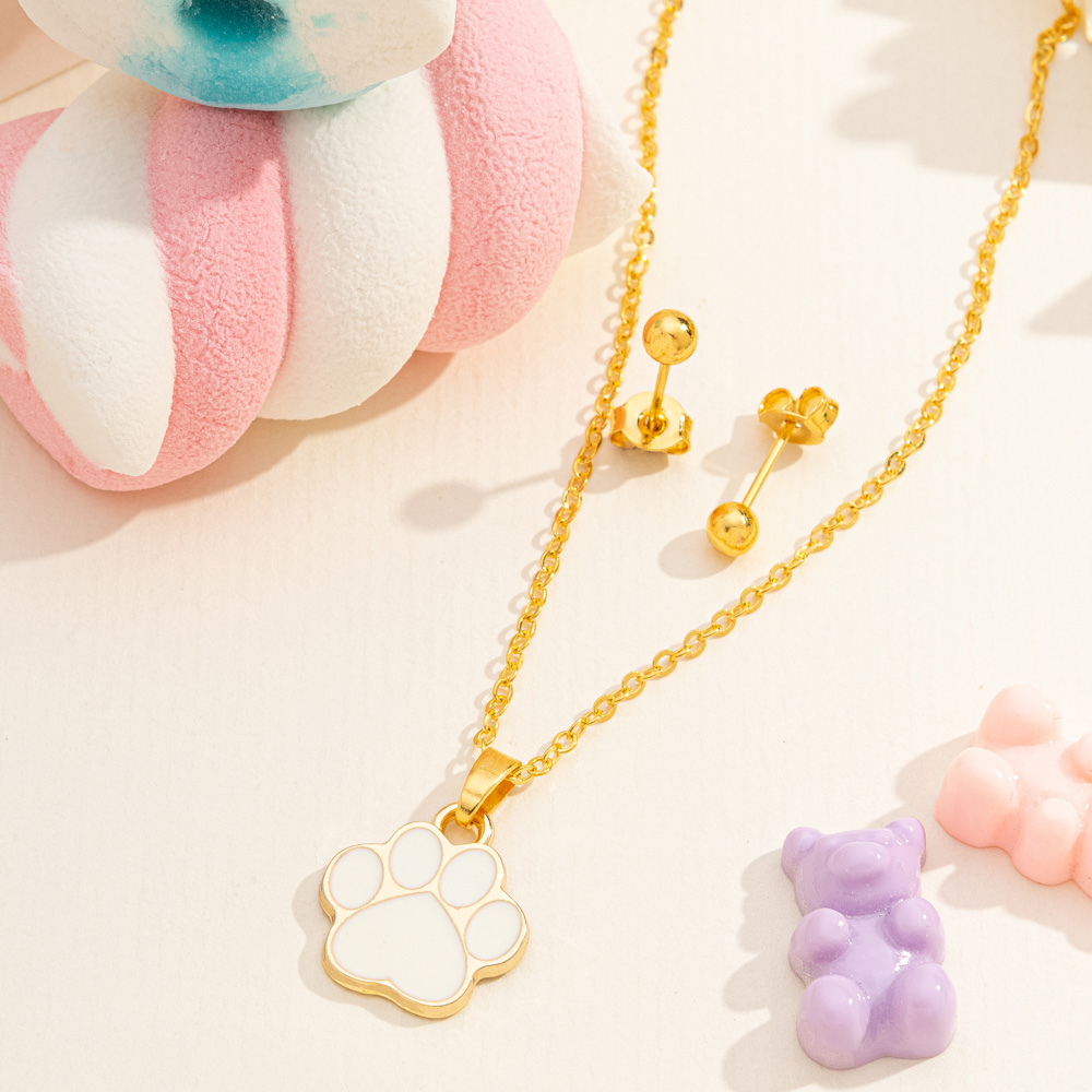 Conjunto infantil com pingente de patinha branca e brinco de bolinha folheado a ouro