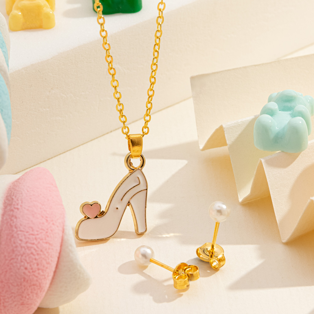 Conjunto infantil com pingente sapato branco e brinco de pérola folheado a ouro
