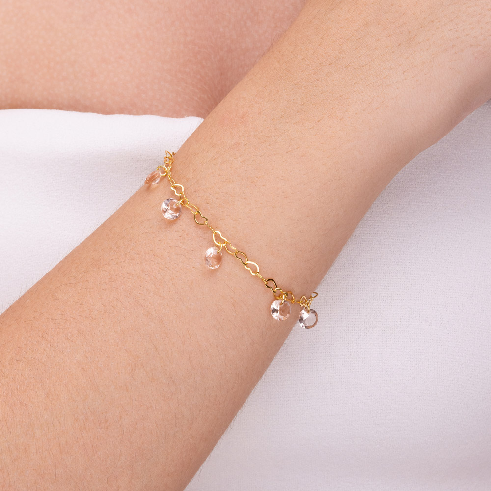 Pulseira com pedra rosa na corrente de coração folheado a ouro