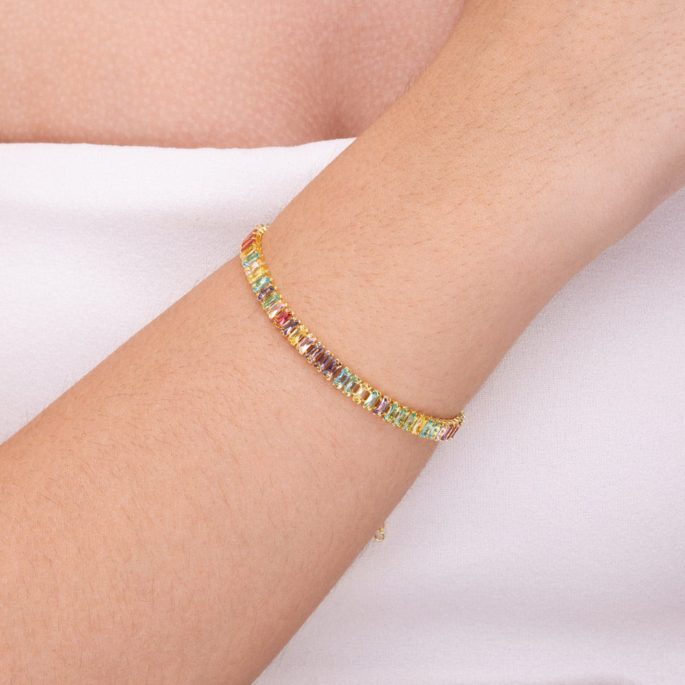 Pulseira rivieira em baguete com zircônia Candy folheada a ouro