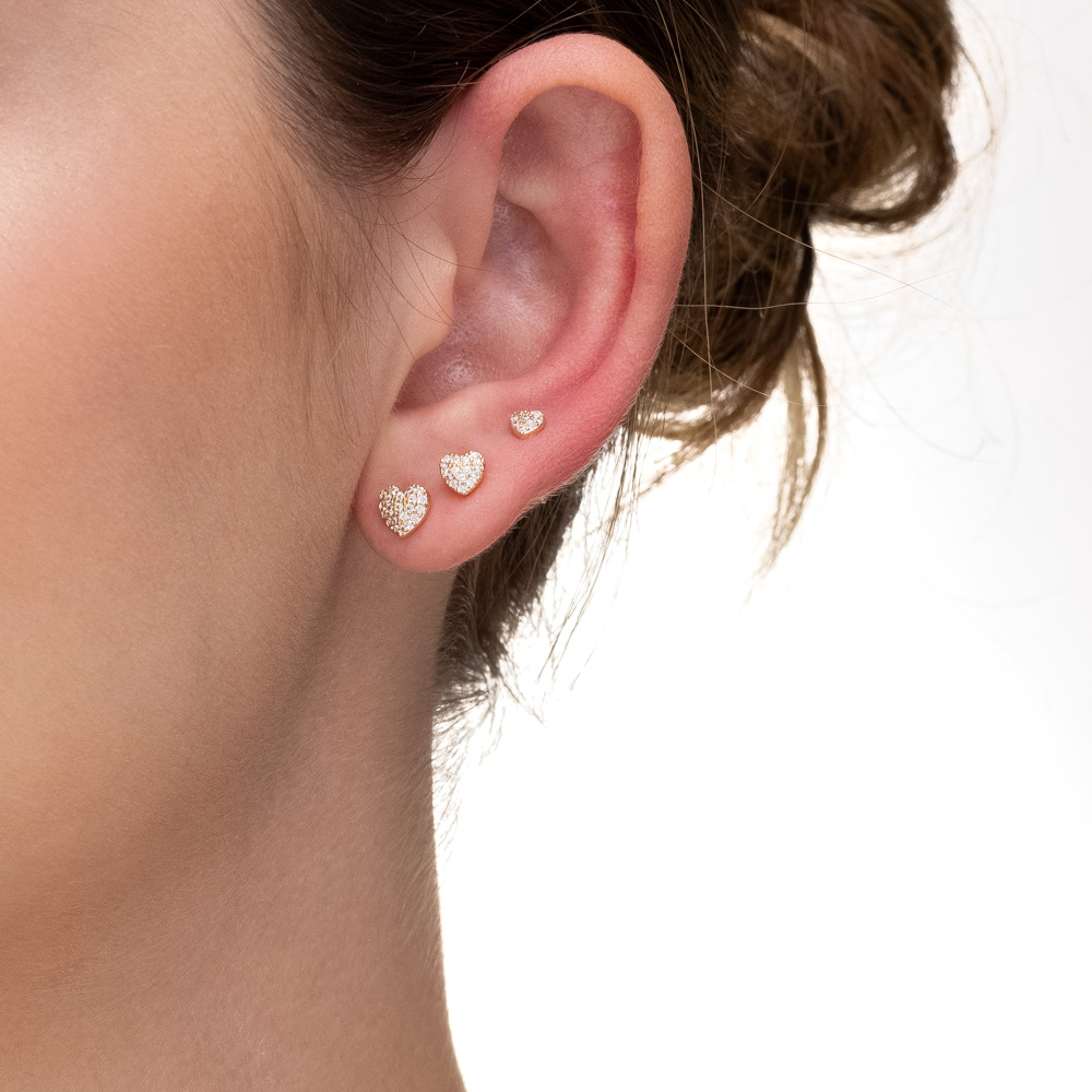 Descrição Curta: O brilho do romantismo multiplicado por três. Este trio apresenta três pares de brincos em formato de coração em tamanhos decrescentes, todos inteiramente cravejados com microzircônias em pavê. Uma escolha clássica e ultra feminina para um visual delicado e iluminado.