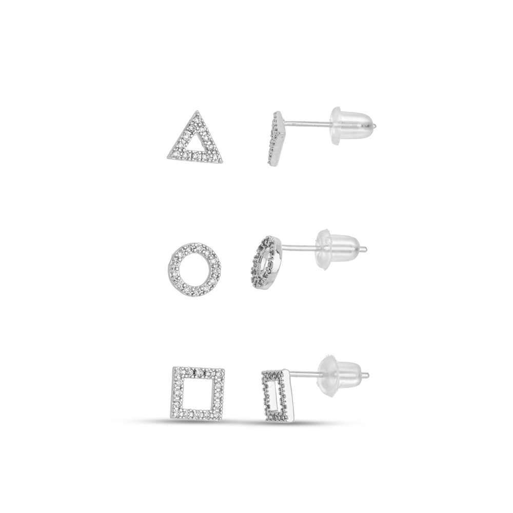 Descrição Curta: Uma composição geométrica contemporânea com a sofisticação do banho de ródio. Este trio apresenta três pares de brincos — triângulo, círculo e quadrado — com design vazado e inteiramente cravejados com microzircônias incolores. É a escolha ideal para quem busca um visual dinâmico, minimalista e iluminado, permitindo infinitas combinações em furos múltiplos.