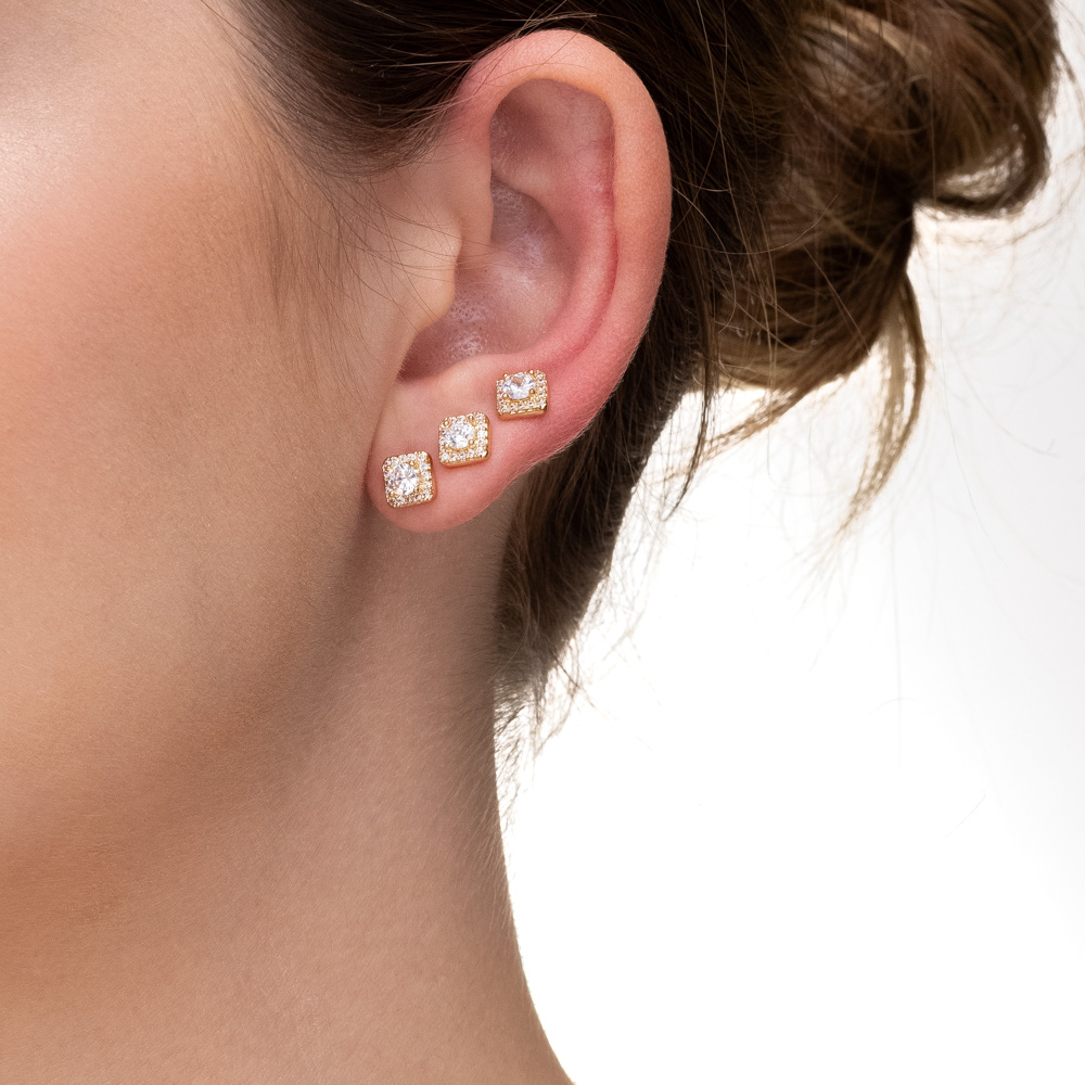Descrição Curta: Sofisticação geométrica em três tamanhos perfeitos. Este trio apresenta brincos de formato quadrado, onde uma zircônia central imponente é emoldurada por uma borda minuciosamente cravejada. É a escolha ideal para quem busca um brilho estruturado e clássico para o dia a dia.