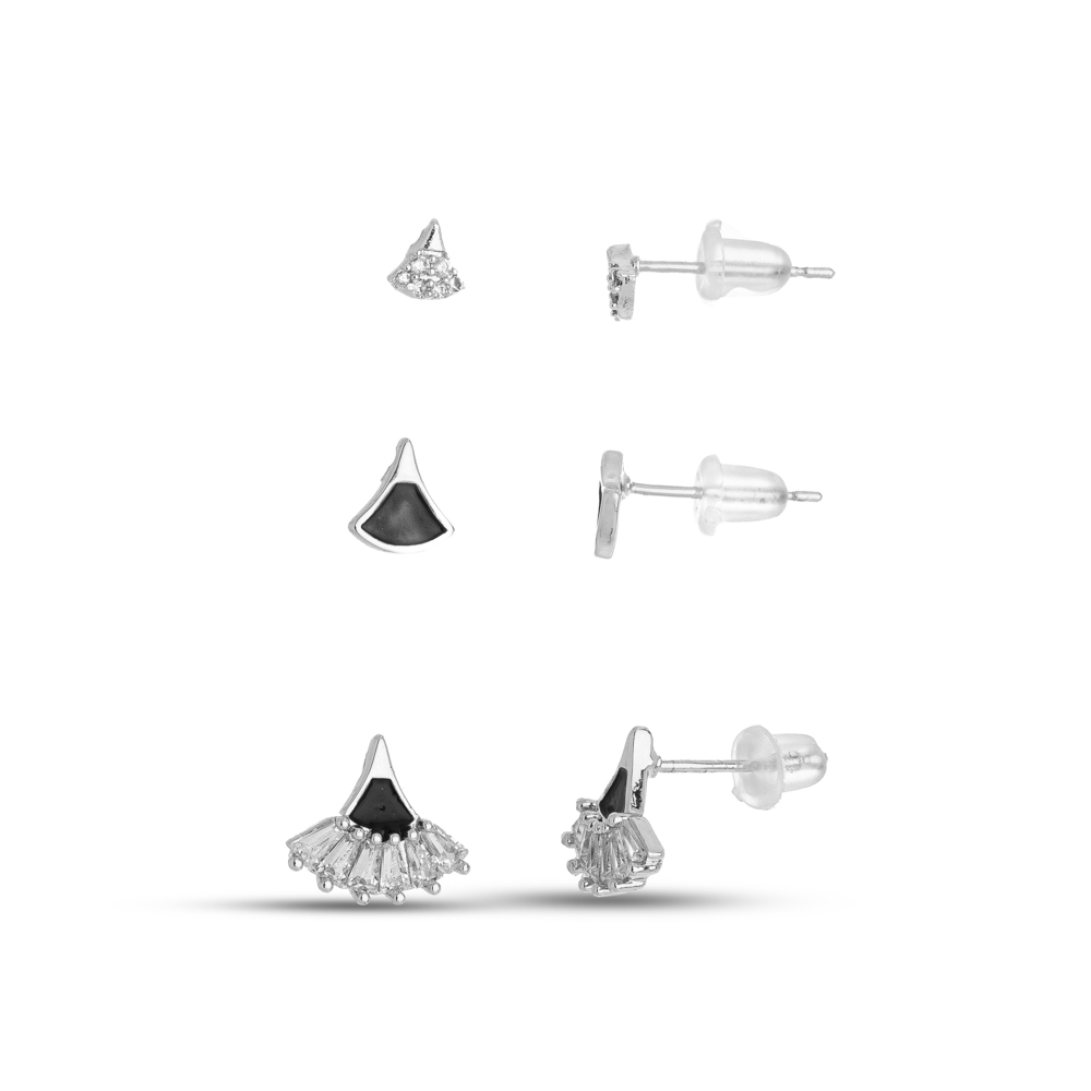 Descrição Curta: Uma composição sofisticada com inspiração vintage e acabamento moderno em ródio. Este trio exclusivo apresenta designs em formato de leque, alternando detalhes em resina preta profunda com o brilho de zircônias em lapidação baguete e redonda. É o conjunto ideal para quem busca um visual de autoridade e luxo contemporâneo.